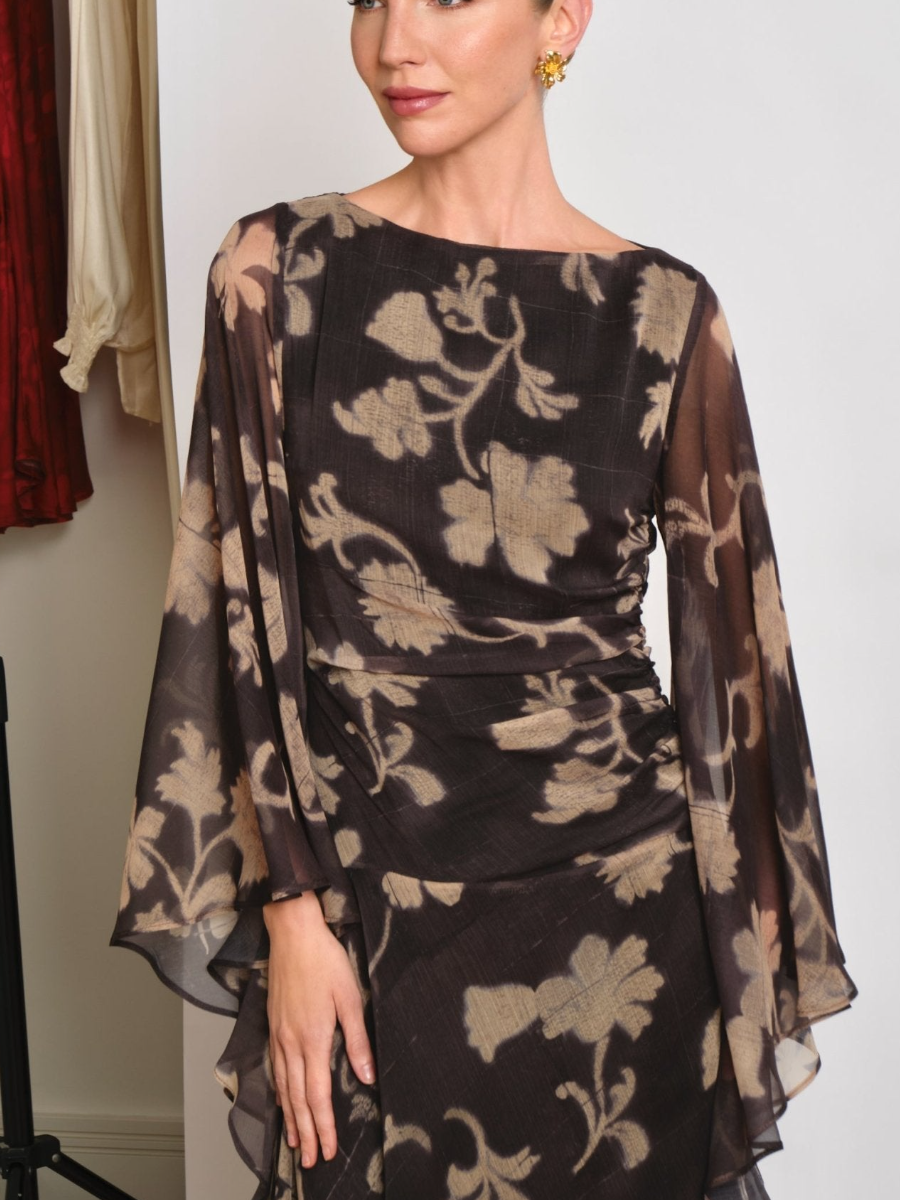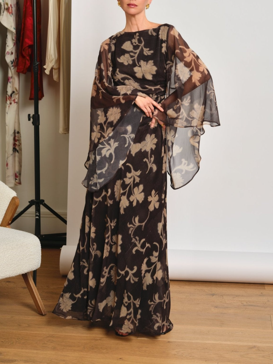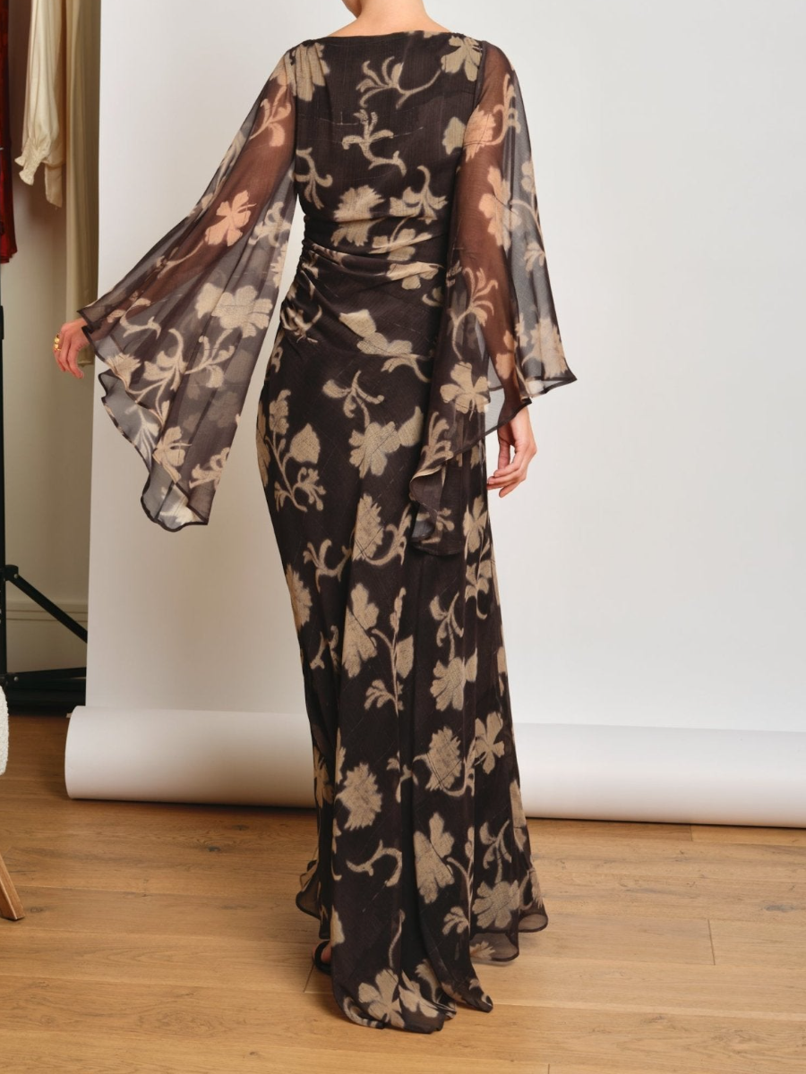 Long printed dress with a boat neckline and wide sleeves , which adds a touch of elegance and modernity.