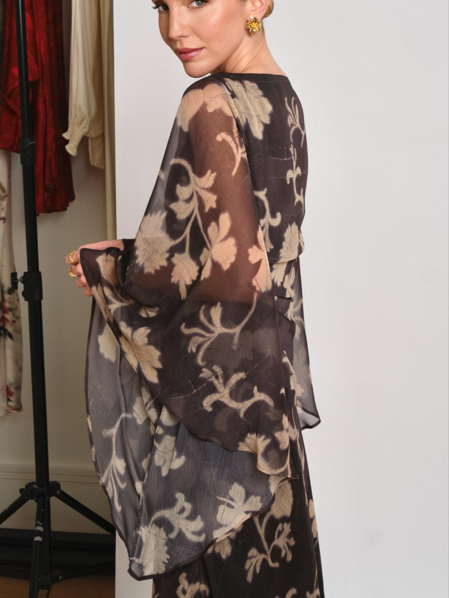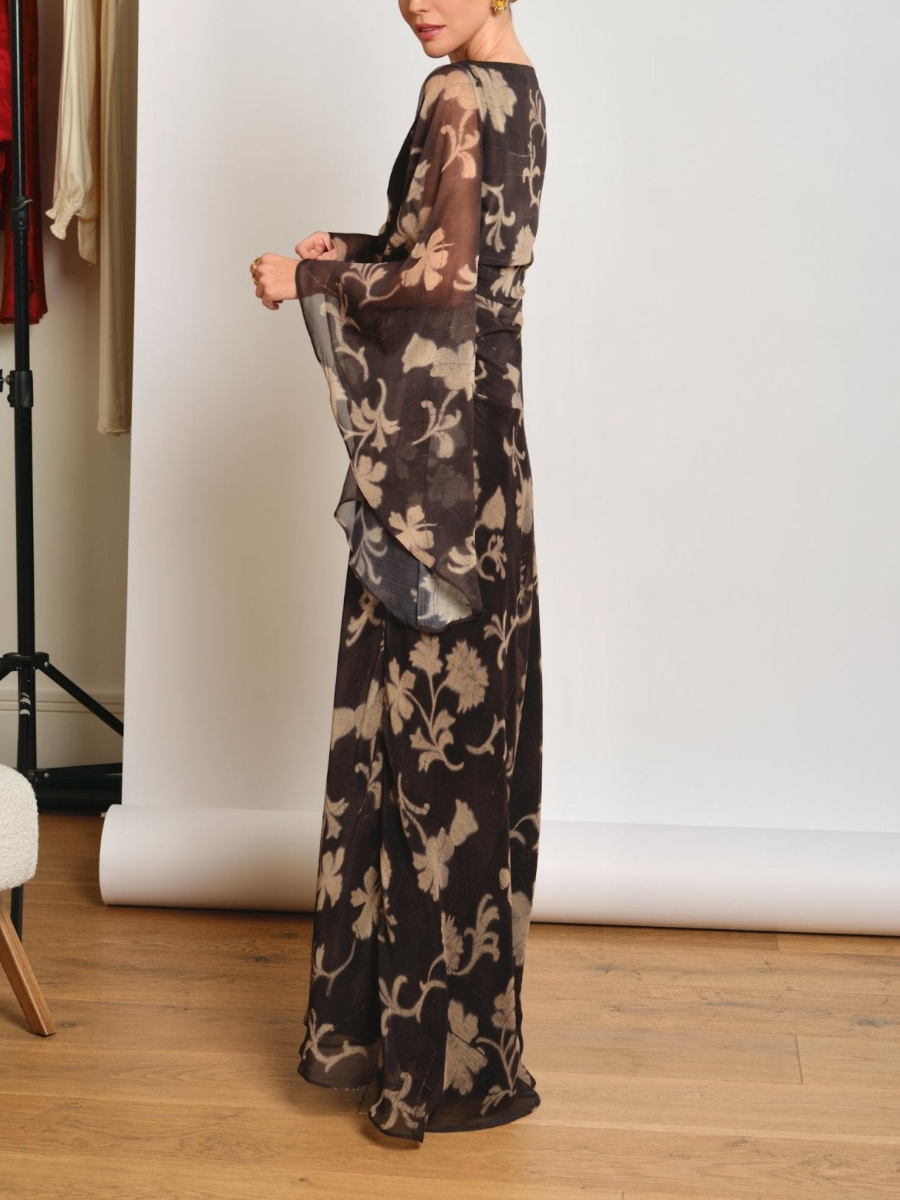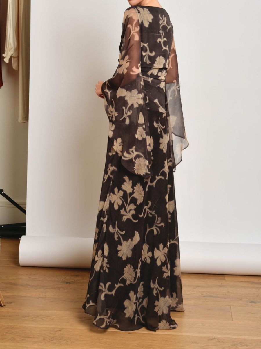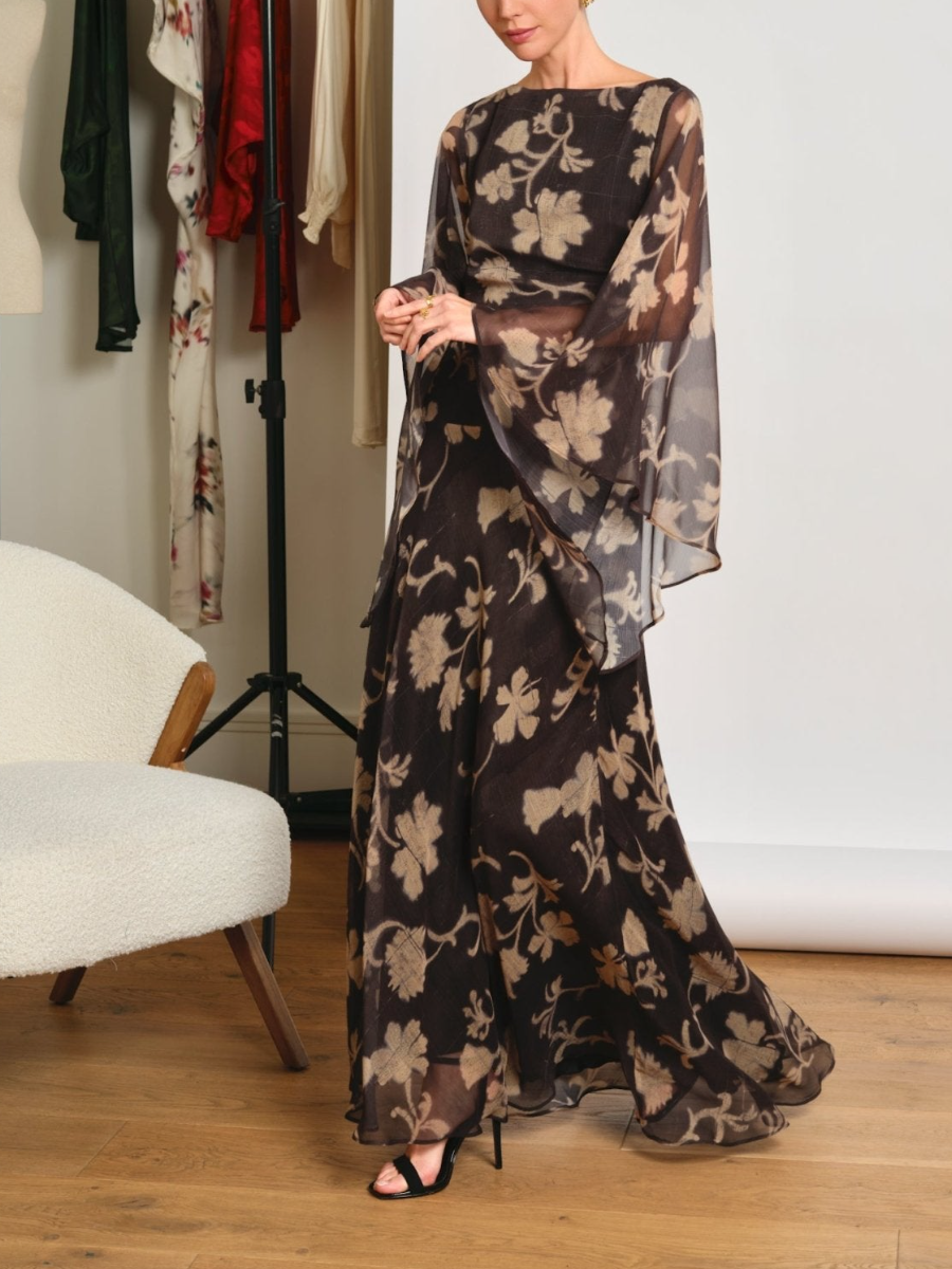 Long printed dress with a boat neckline and wide sleeves , which adds a touch of elegance and modernity.