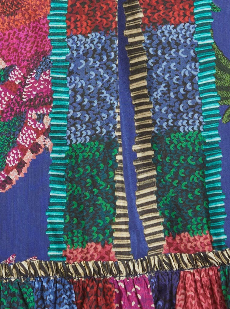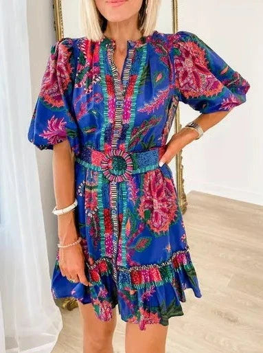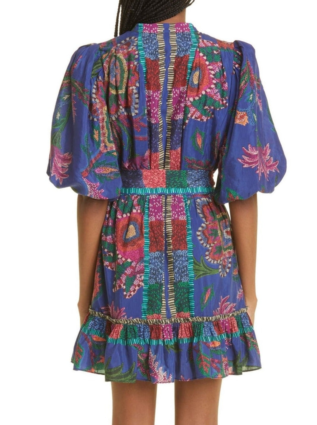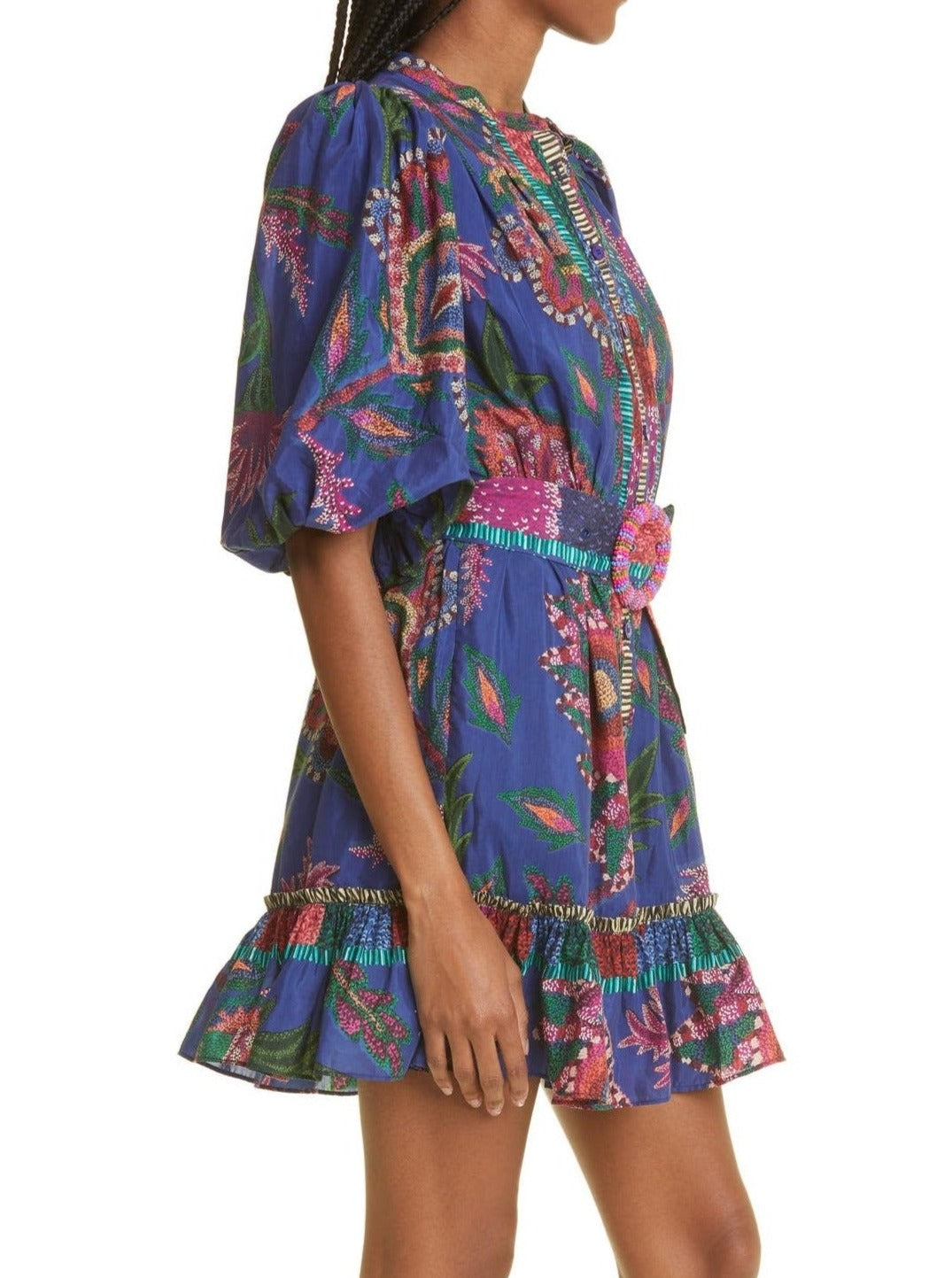 A beaded buckle accents the belted waist of a color-drenched minidress designed with airy puff sleeves and a buoyant flounce hem.