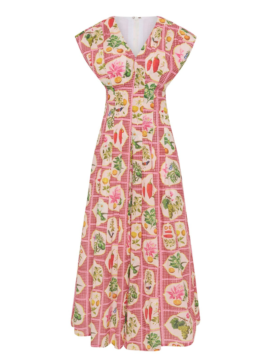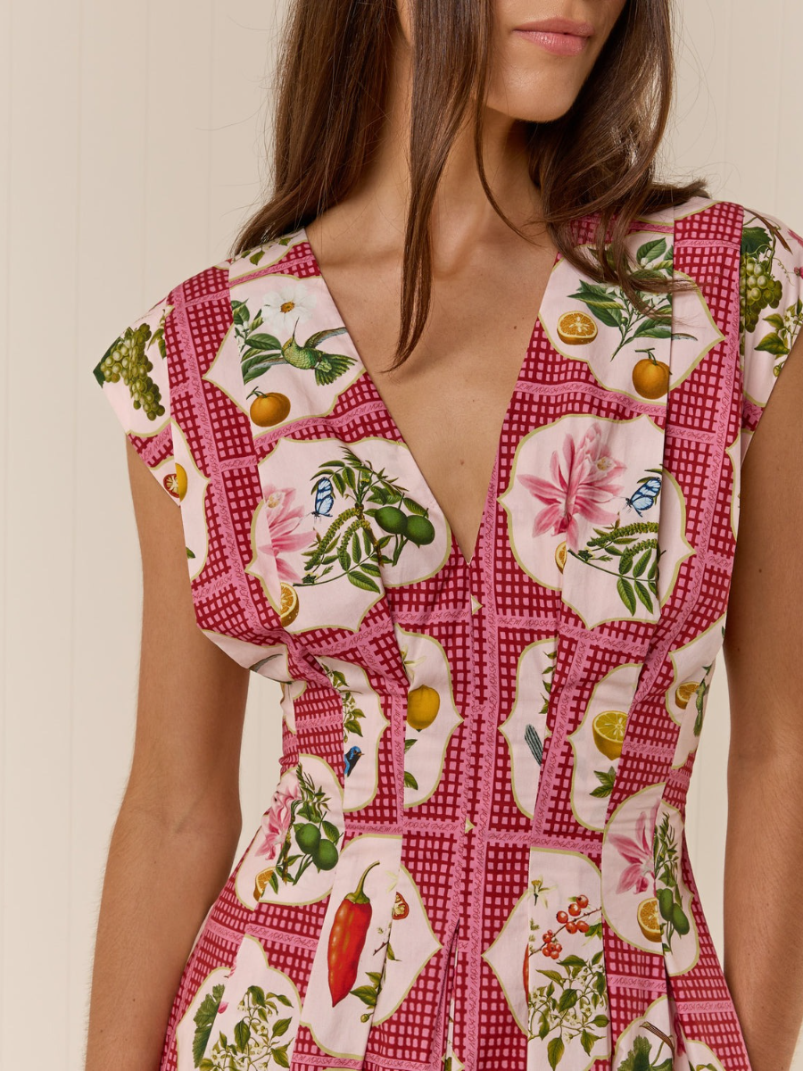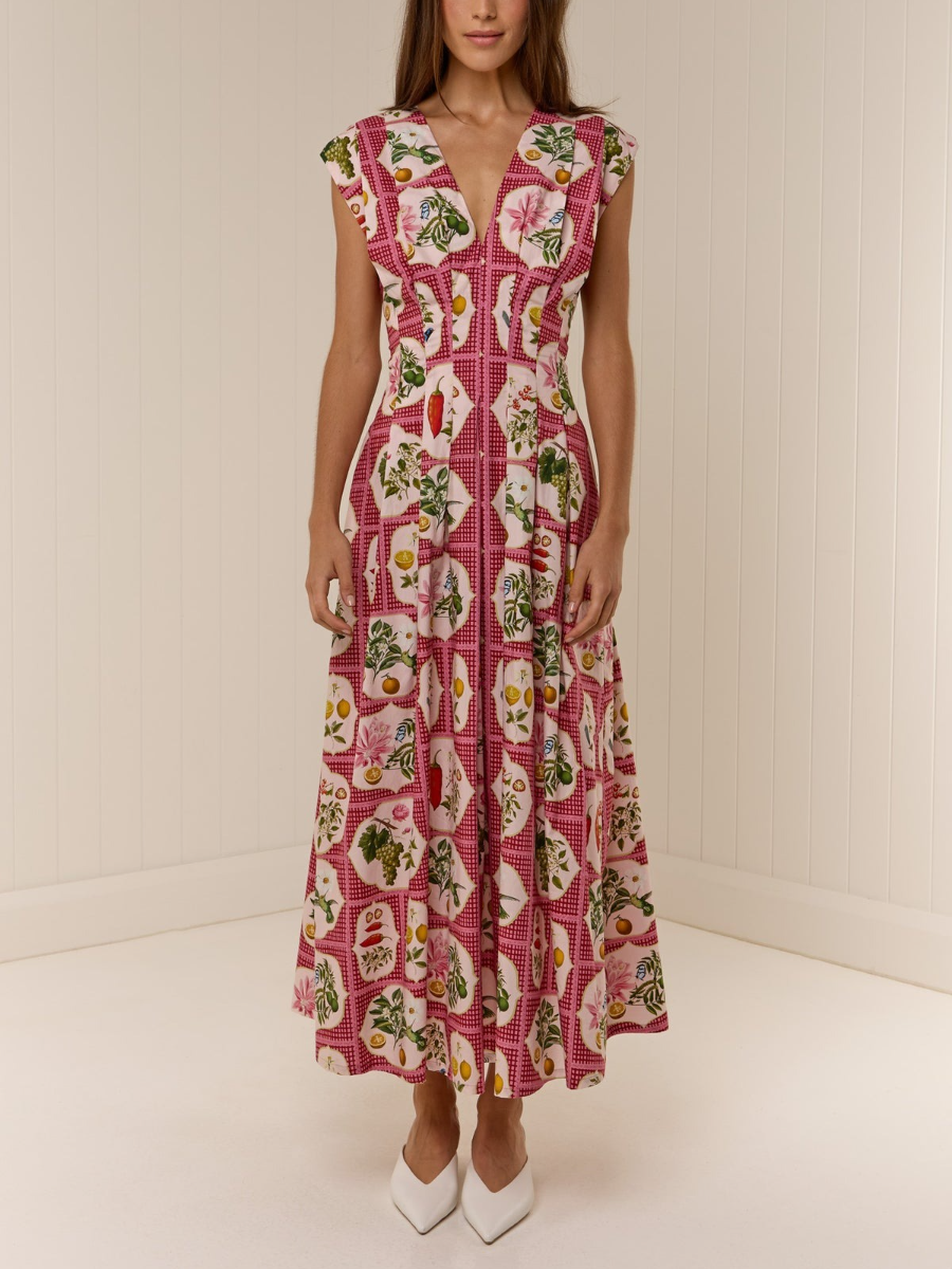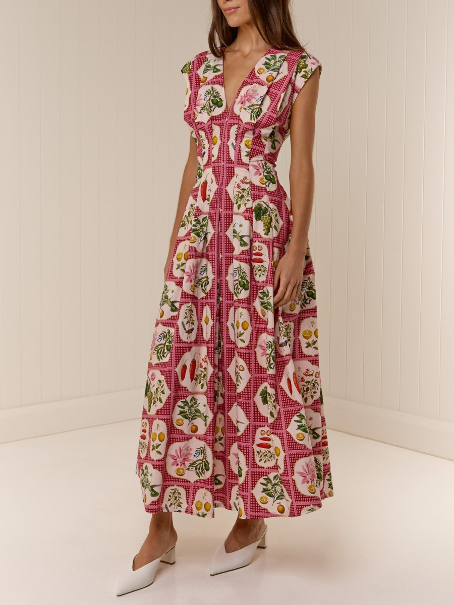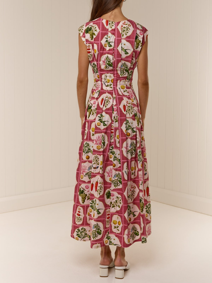 The Carter Dress is crafted from a premium Cotton Poplin, printed in our exclusive Pink Citrus Tile. Offering a flattering tailored fit with tucked detailing that contours through the slim waistline to an A line skirt. The neckline is a flattering V-shape, that also features a hidden hook and eye for additional coverage if desired. Please refer to our size and fit guide for further fit details.