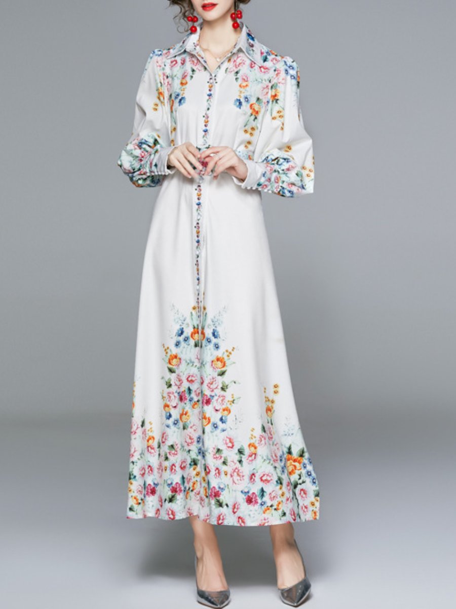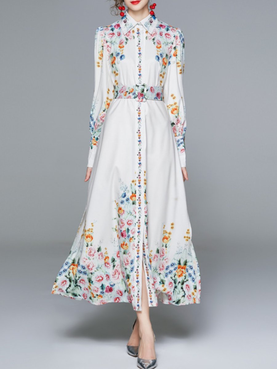 The Olivia shirt dress is made from linen to a midi silhouette. It features a floral design and is fastened with buttons in front.