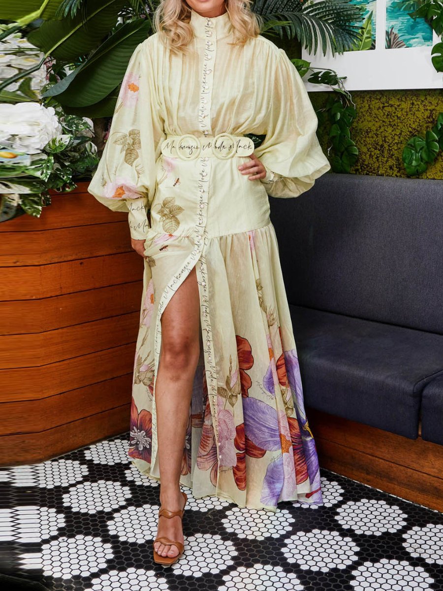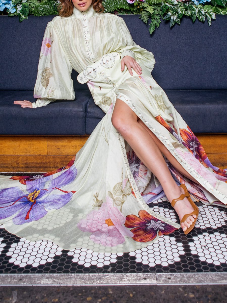 This Dress takes a stroll through a decadent garden of feminine coloured blooms intertwined with green ivy twisting the body perfectly. A show-stopper in every way, this luxury occasion maxi dress is home to extravagant puff sleeves, a classic tailored waistline with front button detail, that flares softly into a full length skirt of cascading blooms that dance into a full length hemline.