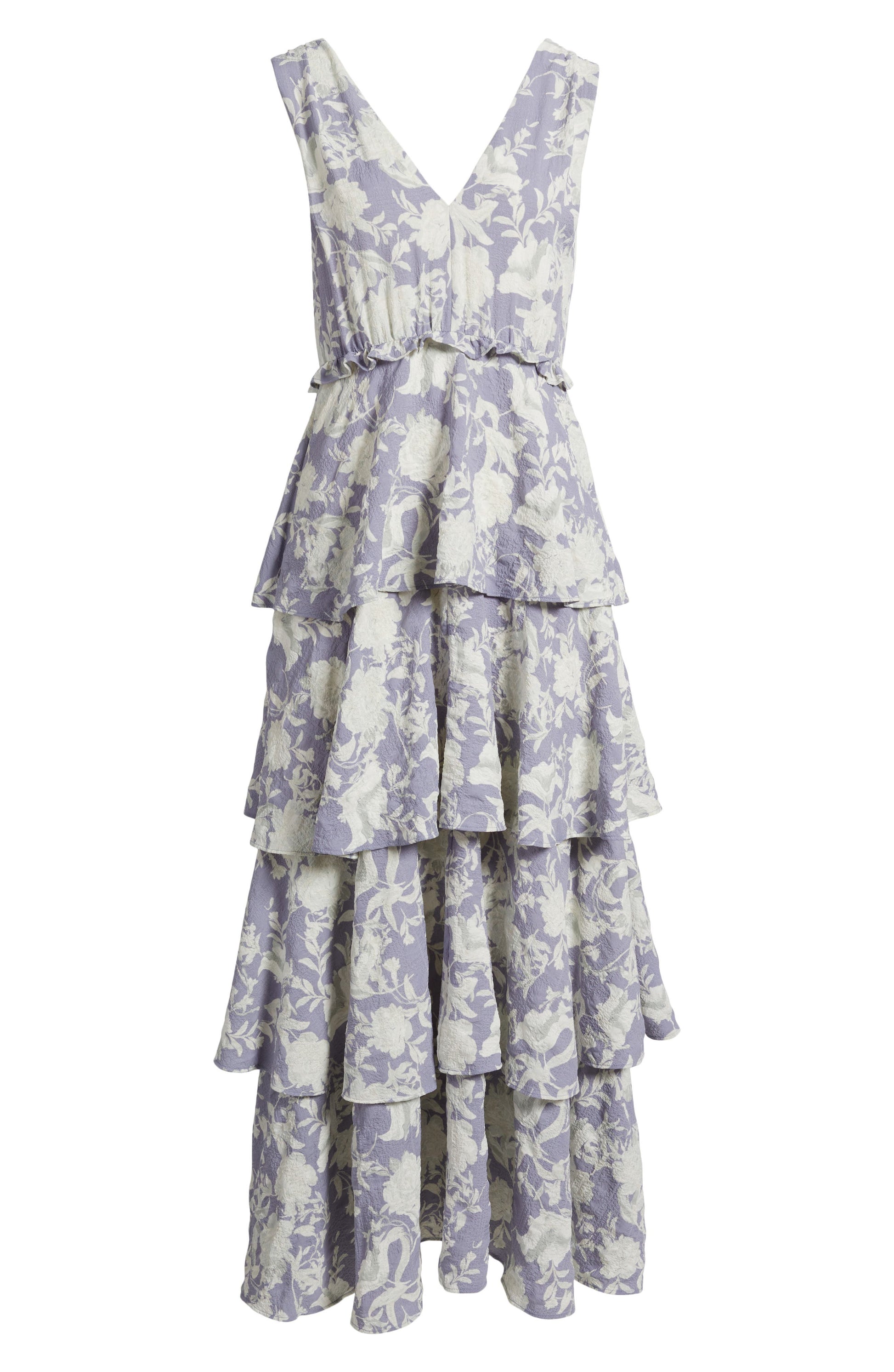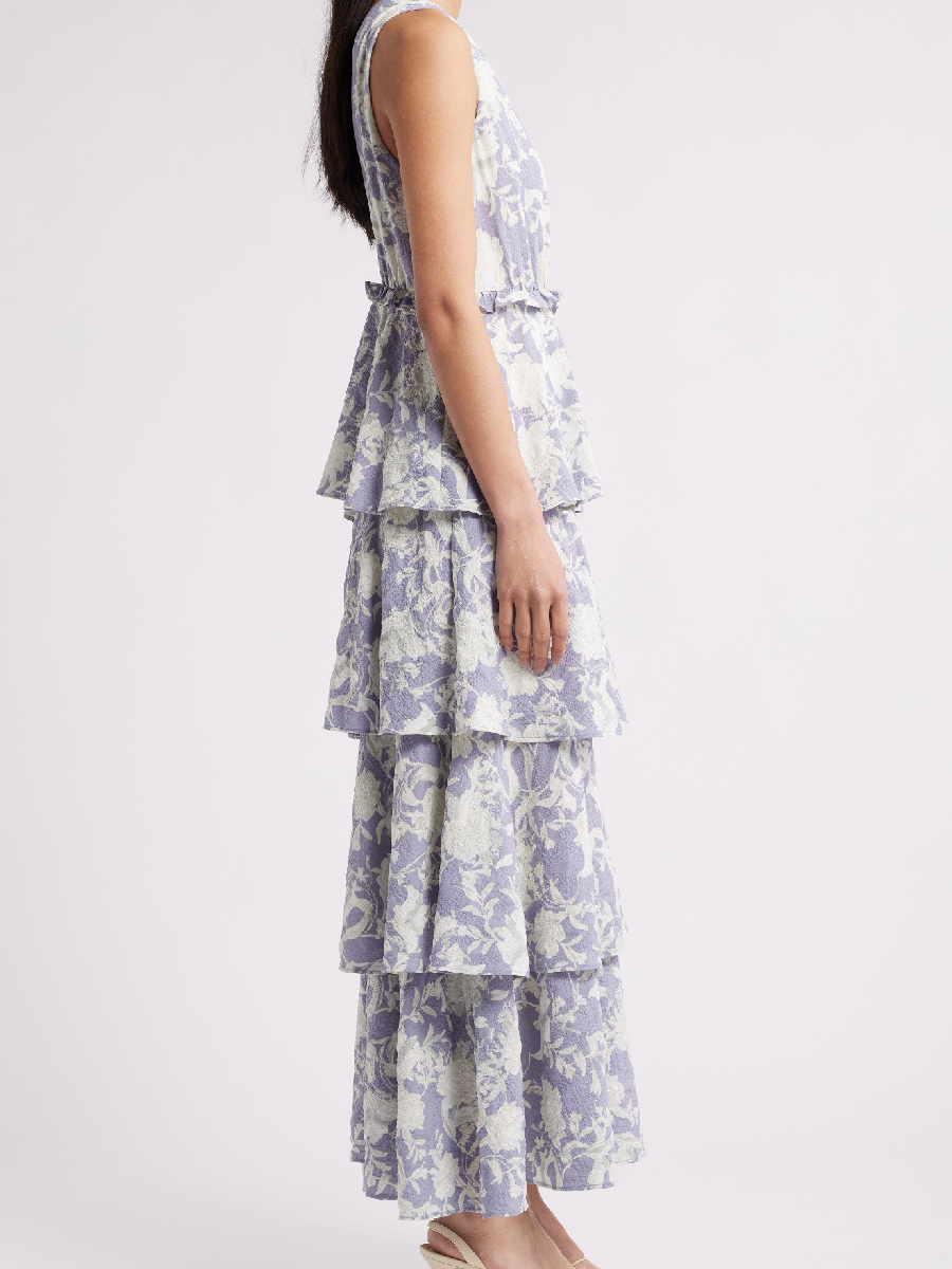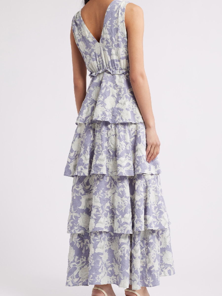 A bold floral print adorns this resort-ready maxi dress sweetened by lightweight ruffles in a tiered silhouette.
