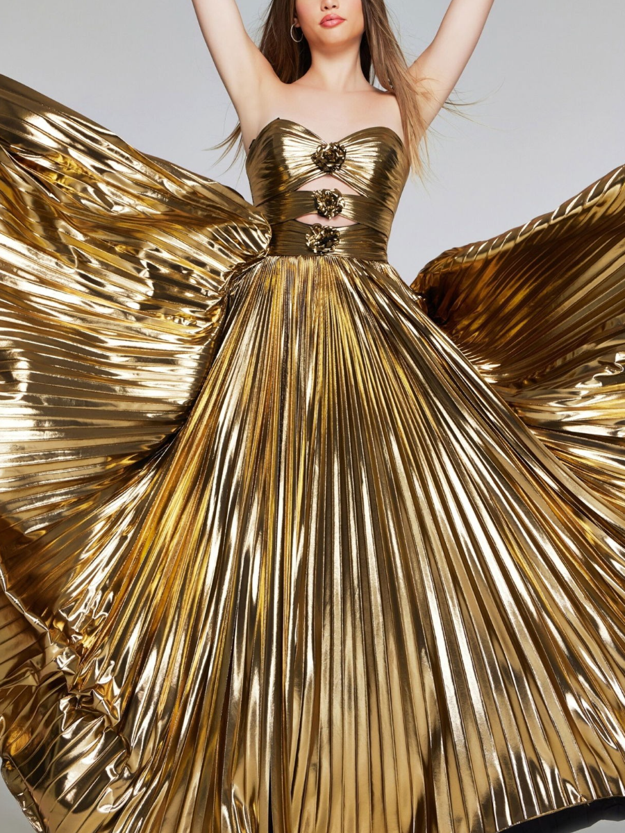 This stunning strapless ballgown features a luxurious metallic gold fabric that captures light brilliantly, creating a shimmering effect. The bodice boasts attractive rosettes and cut-out details, adding a sculptural touch to the dress. The floor-length skirt is beautifully pleated, enhancing its voluminous silhouette and creating an elegant, flowing movement. The closed back accurately balances the bold front design, making this gown a perfect choice for any formal event or glamorous occasion.