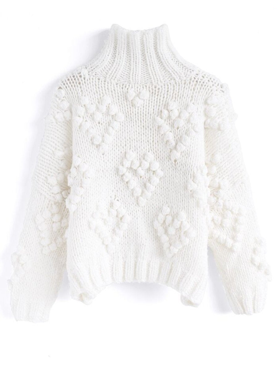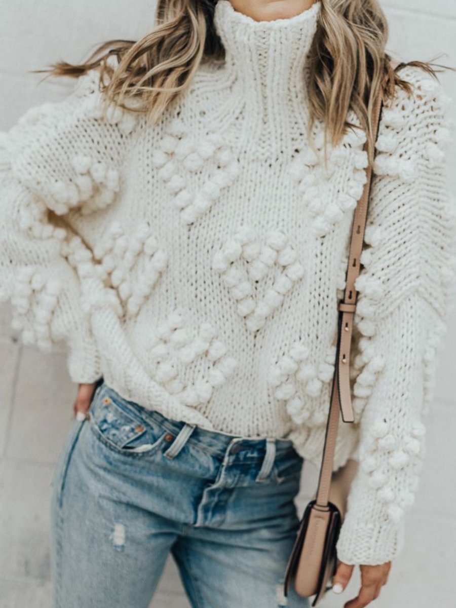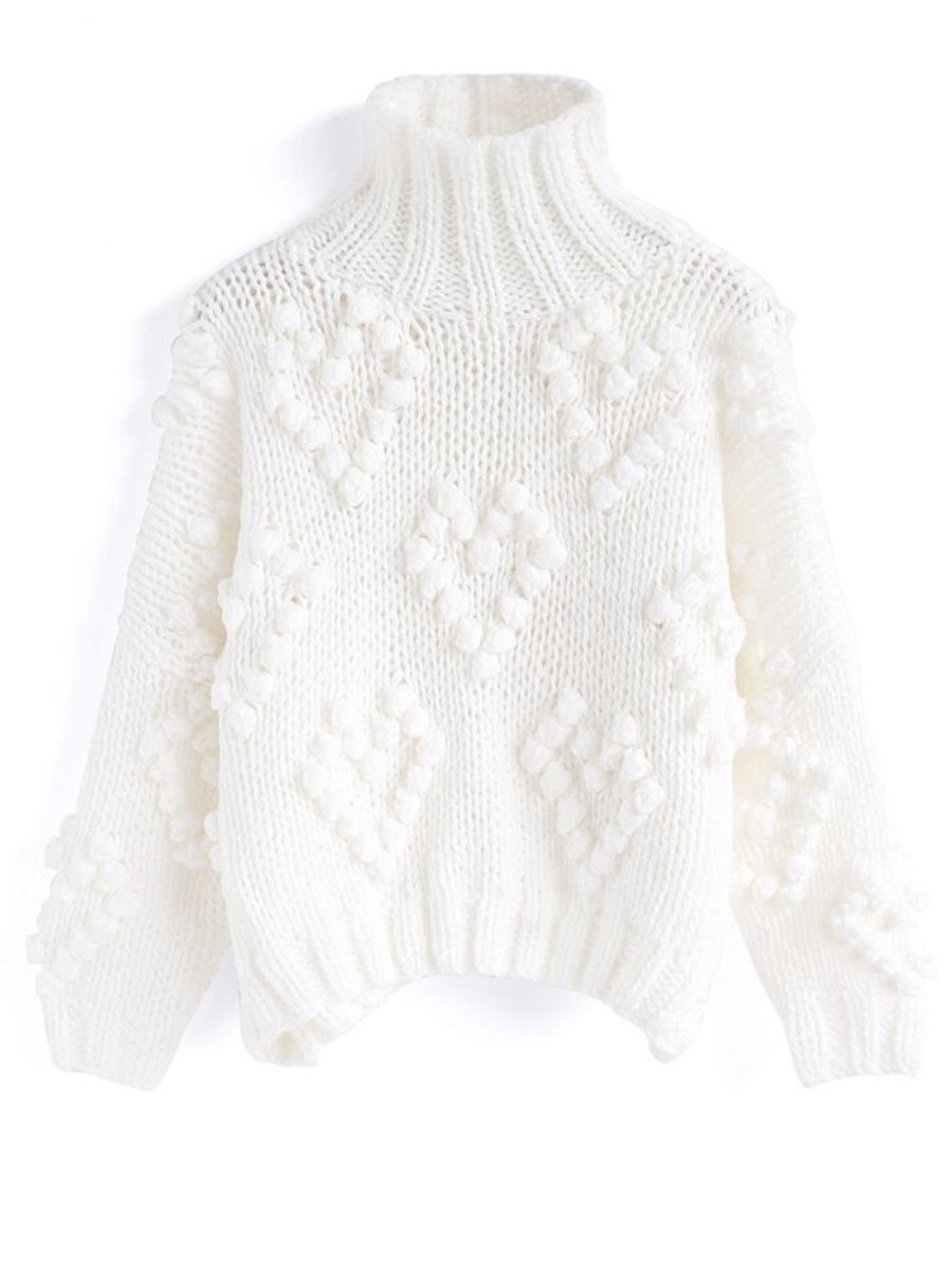 Bring all the chic fun to fall with this lovely turtleneck sweater with yarn ball appliques in a solid white hue.