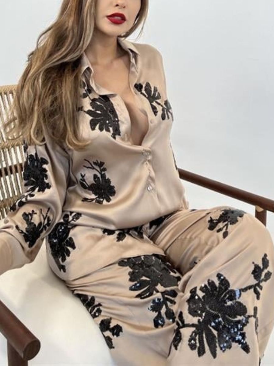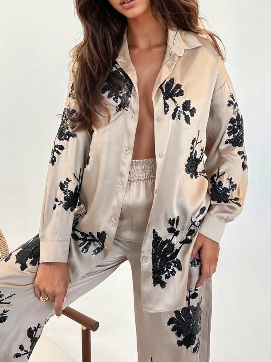 - Be the center of attention with our two-piece set, crafted from luxurious materials that exude elegance and sophistication. The smooth ice silk cotton fabric offers a sleek, polished look, making this set perfect for events, parties, or any occasion where you want to sparkle. Whether you're staying at home or dressing up for a special event, this set ensures you make a dazzling impression every step of the way.