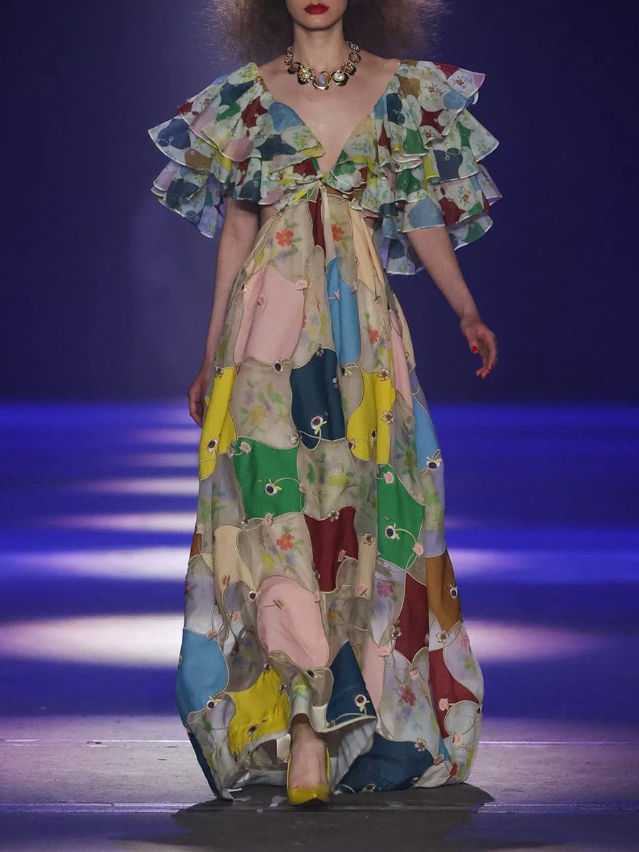 Look your best this summer in this stylish ruffled-shoulder maxi dress. It's bold print will turn heads, while its comfortable fit guarantees a chic all-day feel. Get ready to make a statement and beat the heat!