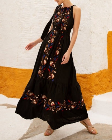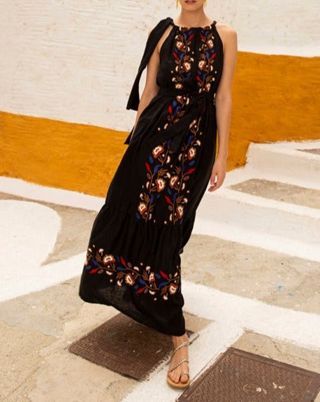 The dress featuring straps that tie at the back of the neck, a matching detachable belt, tiered details on its skirt and embellished with elegant embroideries in a floral motif.